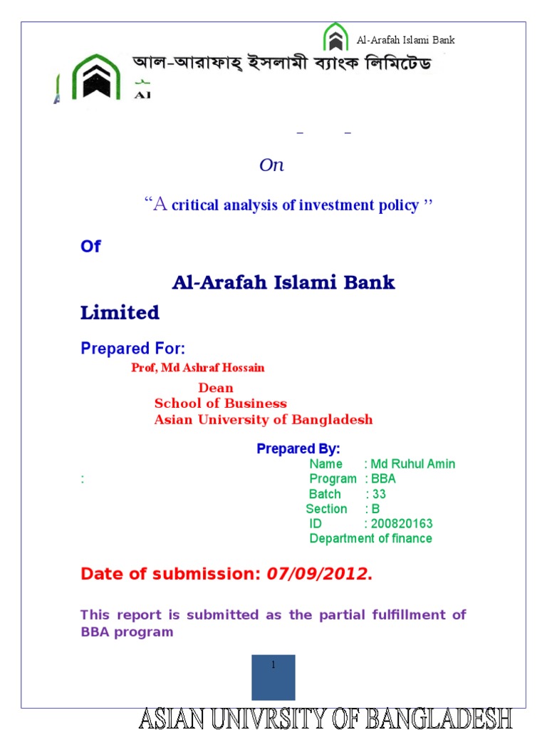 Doc Internship Report On Overall Branch Banking And A Comprehensive Review On Investment Of Al Arafah Islami Bank Limited Arif Siddiqui Academia Edu