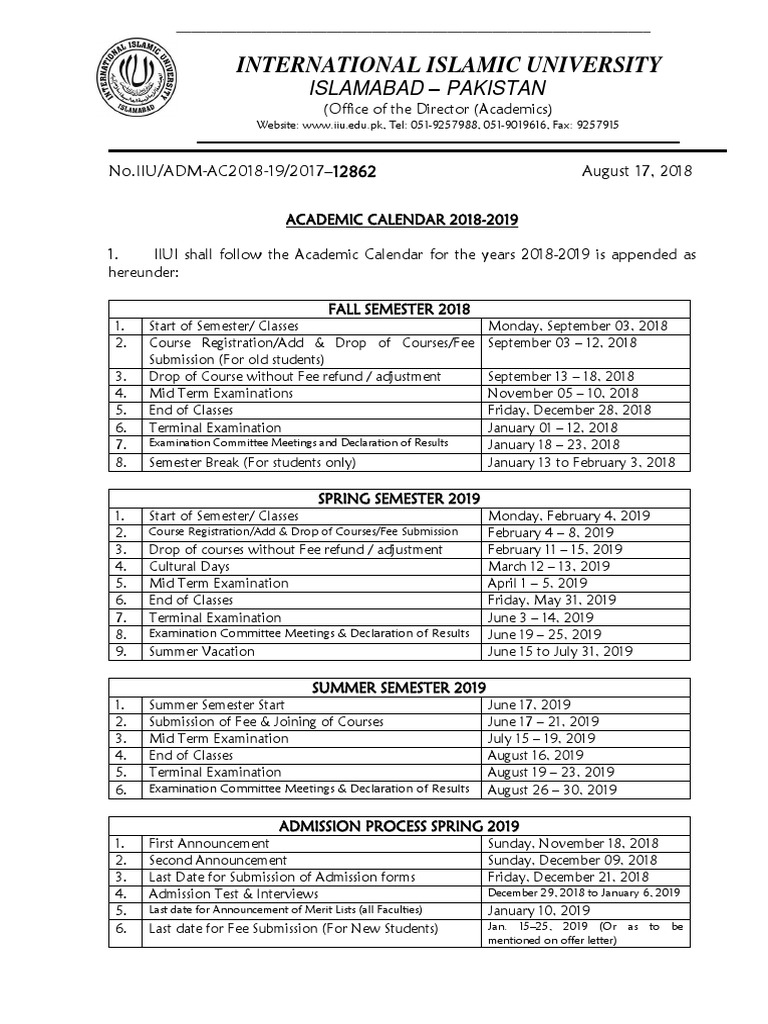 Iiui Students On Twitter Academic Calendar Of Iiui For Spring Semester 2018