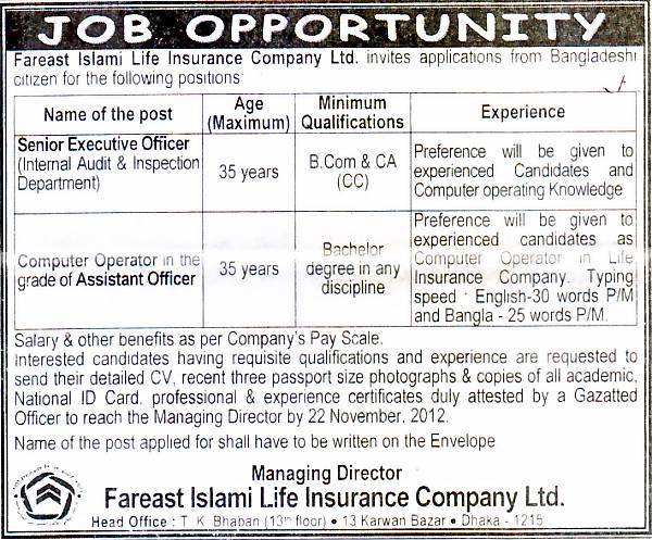 All Newspaper Jobs Fareast Islami Life Insurance Company Ltd Post Senior Executive Officer Asst Officer