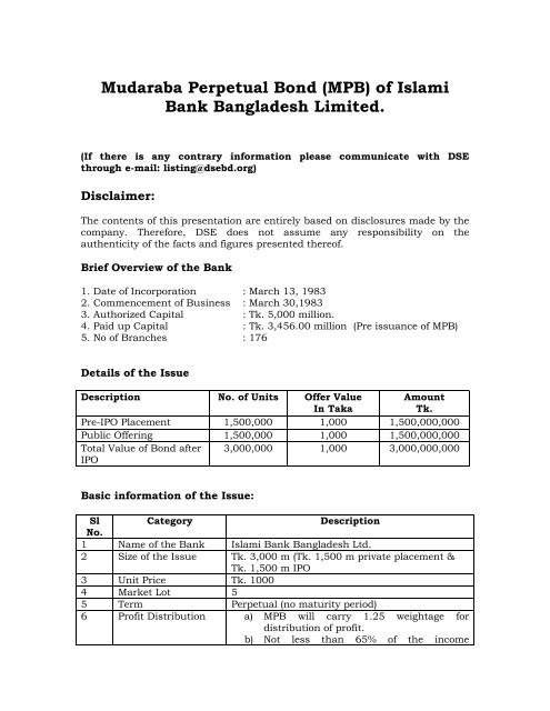 Mudaraba Perpetual Bond Mpb Of Islami Bank Bangladesh Limited