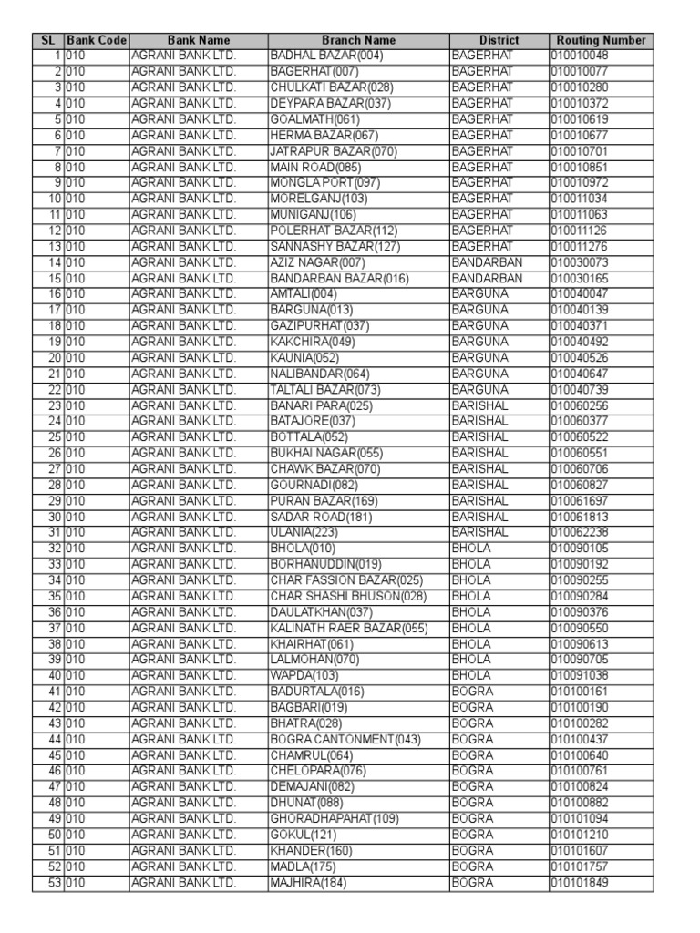 Bangladesh Automated Clearing House Al Arafah Islami Bank Code 3 Digits District Branch Name Br Code Routing Number Al Arafah Islami Bank Ltd Kazirhat 041 015860419 Sub Total 1