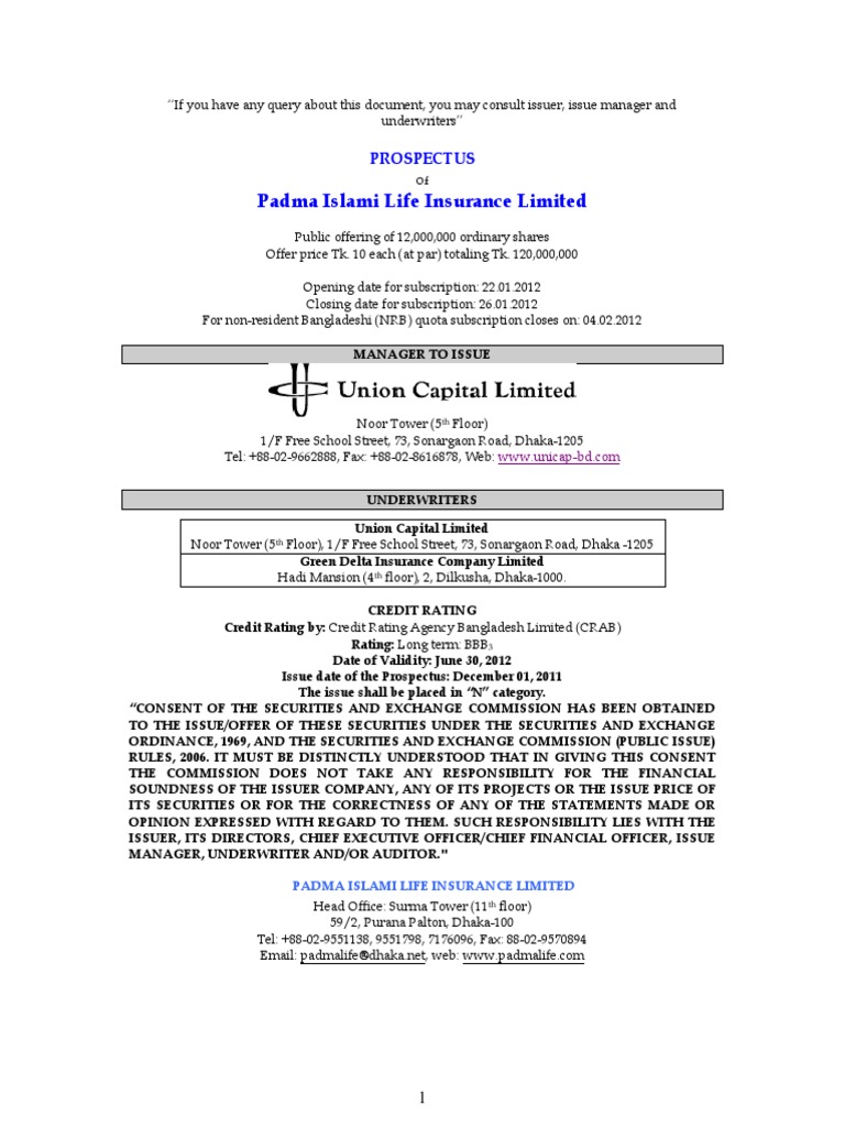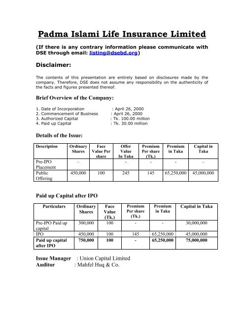 Padma Islami Life Insurance Ltd Initial Public Offering Securities Finance