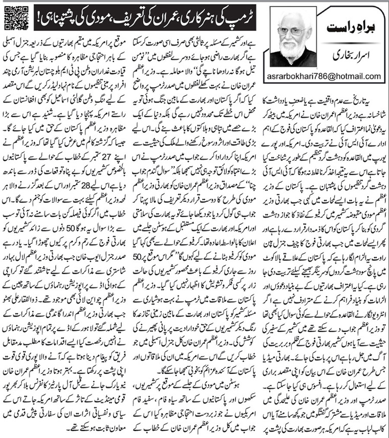 Trump Ki Hunar Kaari Imran Ki Tareef Modi Ki Pushtpanahi Urdu Column By Israr Bukhari 26 September 2019 Darsaal