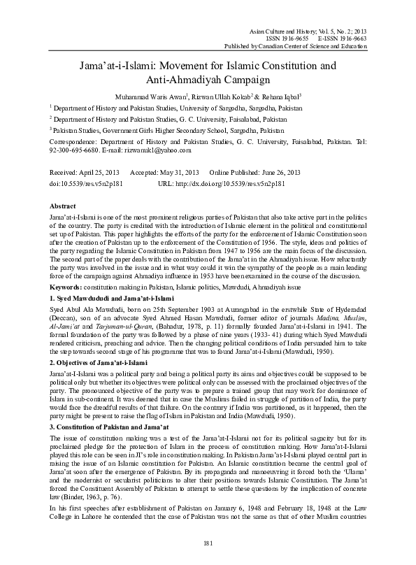 Pdf Jama At I Islami Movement For Islamic Constitution And Anti Ahmadiyah Campaign Rizwan Ullah Kokab Academia Edu