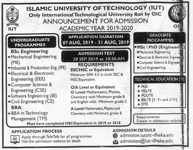 Iut Admission Circular 2019 20 Islamic University Of Technology Admission