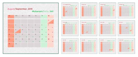 Islamic And Gregorian Monthly Calendar Hijri 1441 Starts Muharram And Christian Starts September 2019 To August 2020 Set Of 12 Months Lunar Cycle Vector Week Starts Sunday Muslim Holidays Marked Royalty Free Vector Graphics