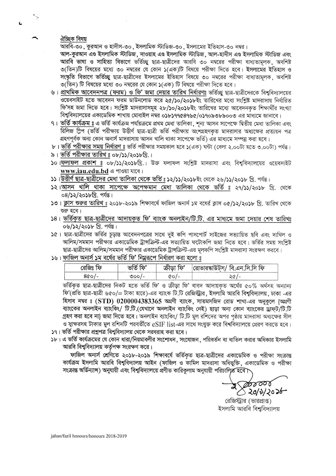 Islamic Arabic University Fazil Honours Admission Notice 2019 2020
