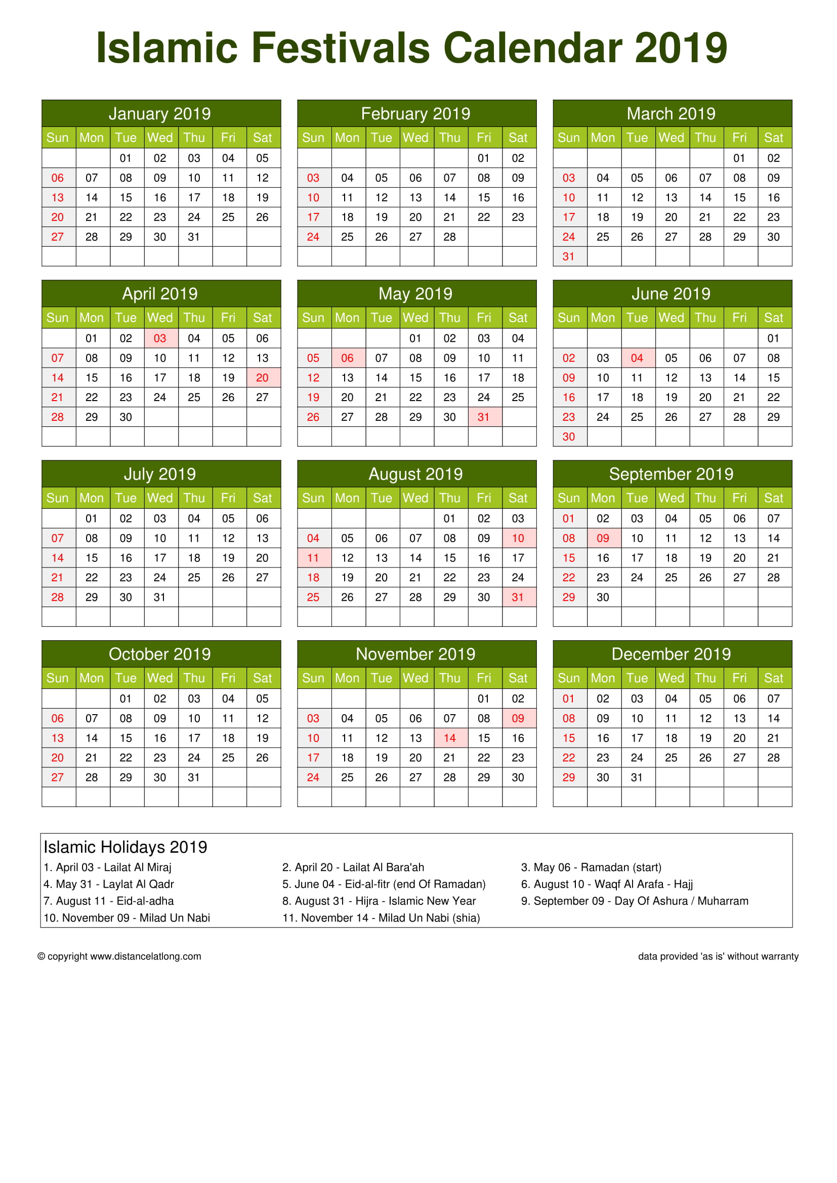 Islamic Calendar 2019 Festivals Holidays