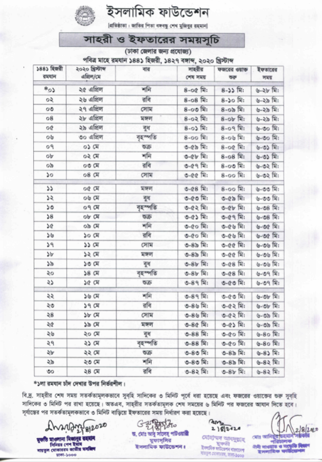 Ramadan Calendar Sehri And Iftar Time 2020 Islamic Foundation Bangladesh