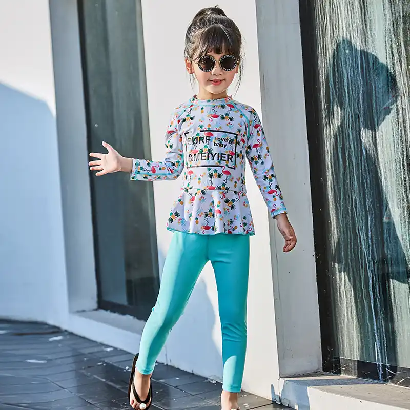 Girls Muslim Swimwear Children S Islamic Swim Wear Flamingo Print Long Sleeve Ruffle Hem Swimsuit Girl Bathing Suit Rash Guards Aliexpress