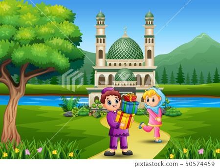 Cute Islamic Boy Giving Gifts To Girl On The Road Stock Illustration 50574459 Pixta