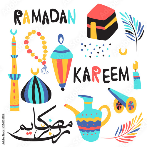 Ramadan Kareem Arabic Calligraphy Set Translation Happy Ramadan Isolated Islamic Symbols Mosque Minaret Rosary Cannon Palm Tree Branch Arab Tableware Dates Candle To Create A Ramadan Des Buy This