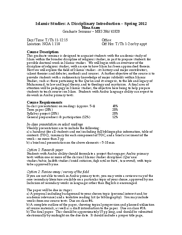 Pdf Syllabus Islamic Studies A Disciplinary Introduction Graduate Hina Azam Academia Edu
