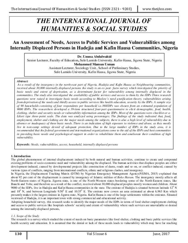 Pdf The International Journal Of Humanities Social Studies An Assessment Of Needs Access To Public Services And Vulnerabilities Among Internally Displaced Persons In Hadejia And Kafin Hausa Communities Nigeria Ma Amun